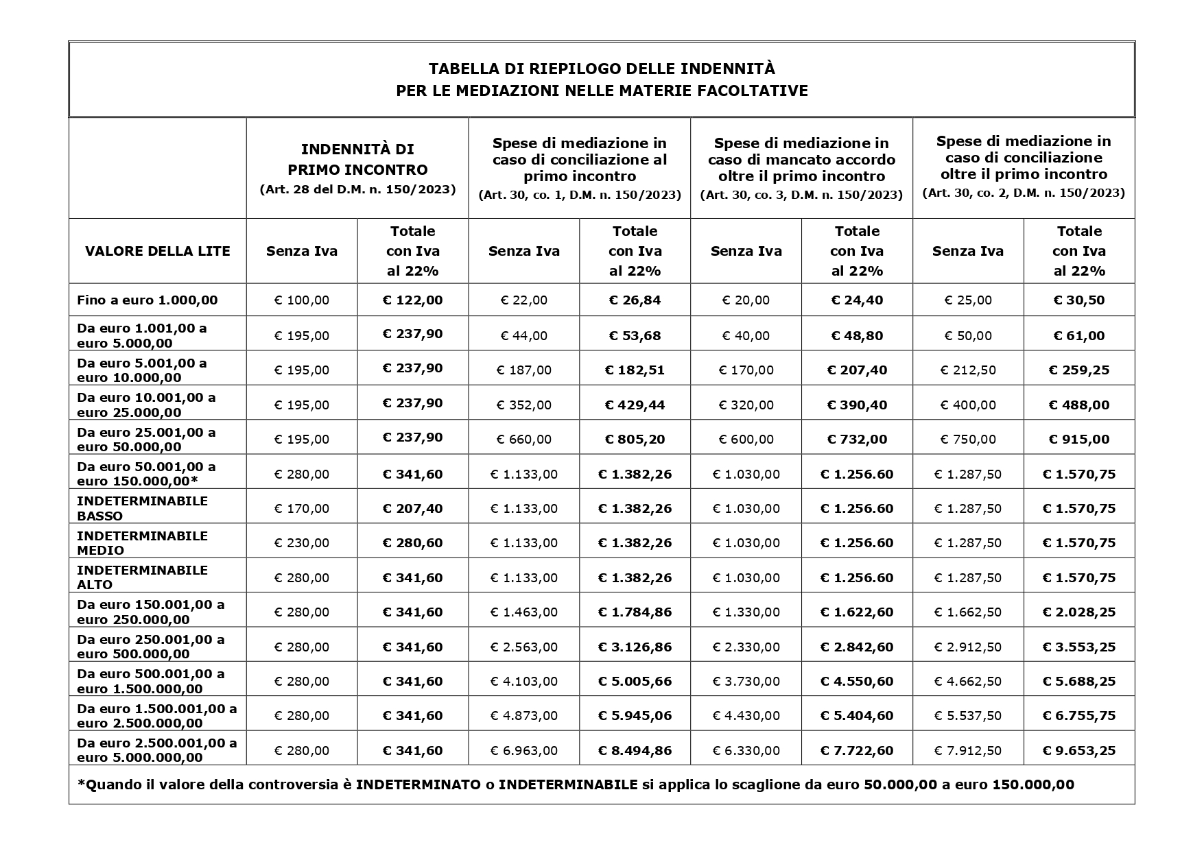 Per le mediazioni nelle materie facoltative o volontarie occorre consultare gli importi indicati nel tariffario.